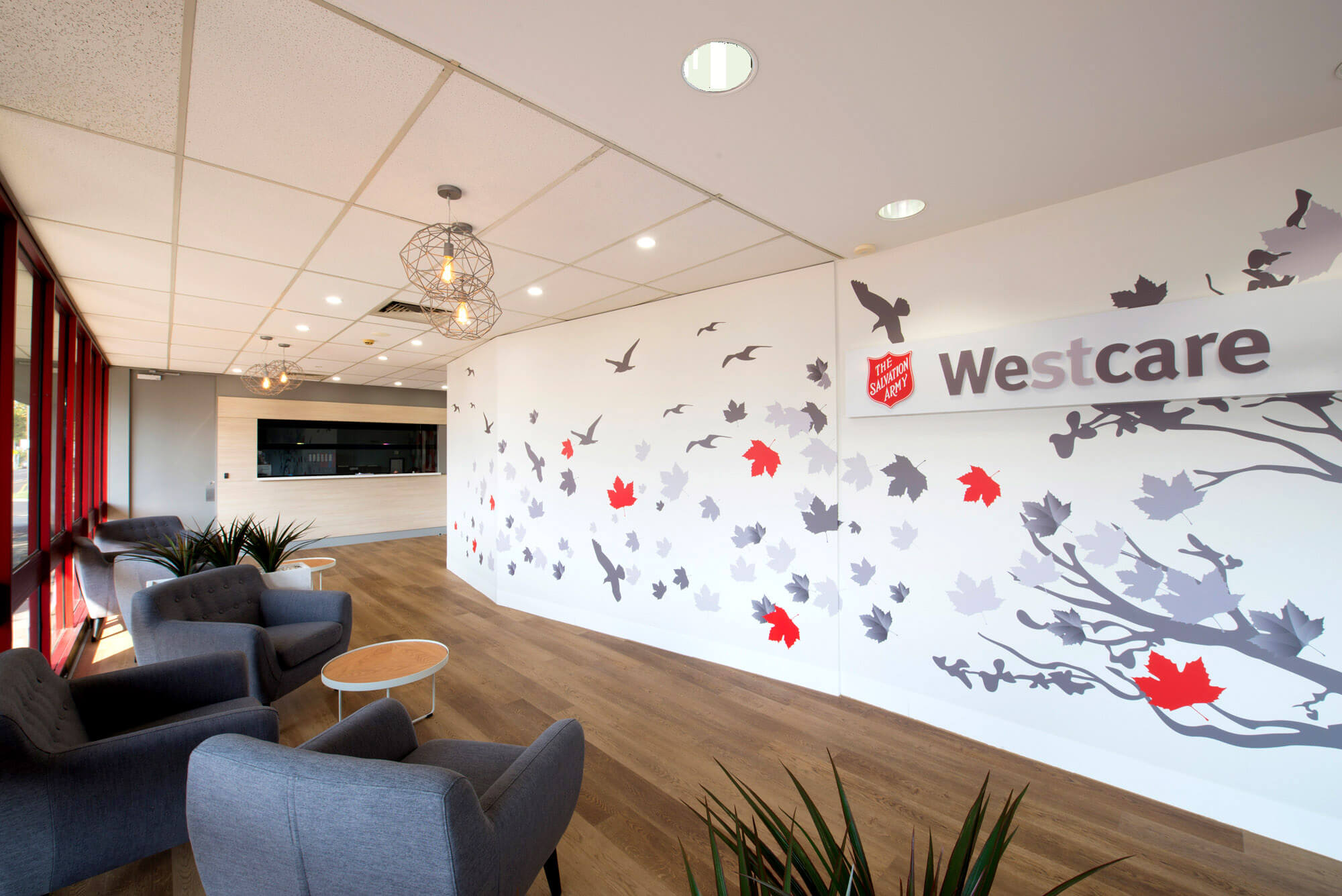The Sunshine office, occupied for many years, required a refurbishment to enhance collaboration and create an inviting waiting area. IN2 SPACE successfully revamped the reception counter and waiting space by installing a feature wall graphic, upgrading finishes, and adding casual seating, pendant lighting, and planters. The result is a transformed space that promotes a calm and inspirational atmosphere for both staff and visitors seeking assistance and support.
