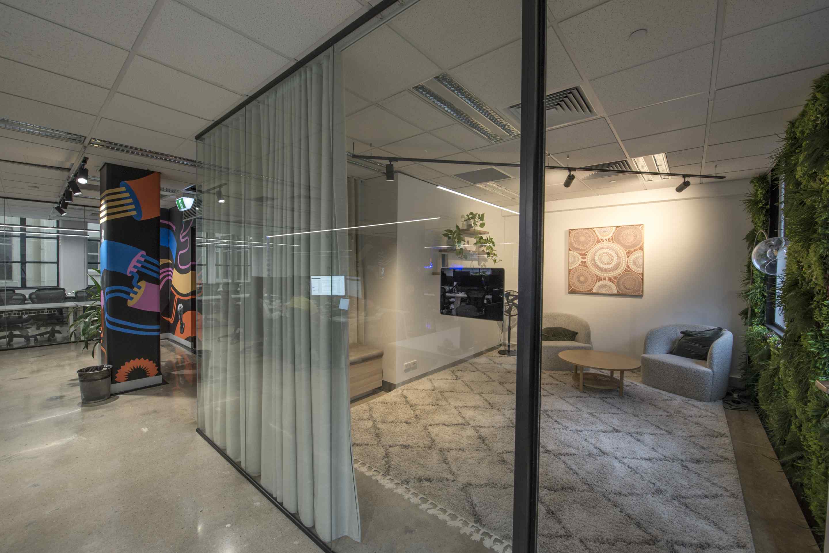 Commercial interior design in Melbourne showing dedicated office meeting room with glass and pull-around curtain for privacy and workspaces for collaboration in near vacinity.